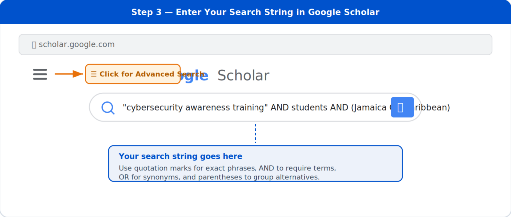 Combine your keywords and synonyms into a search string. The operators below tell Google Scholar exactly how to connect your terms.