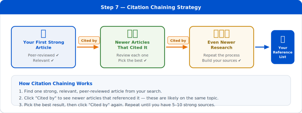 The diagram below illustrates the citation chaining strategy β find one strong article, click “Cited by” to discover newer research, and repeat the process to build your reference list.