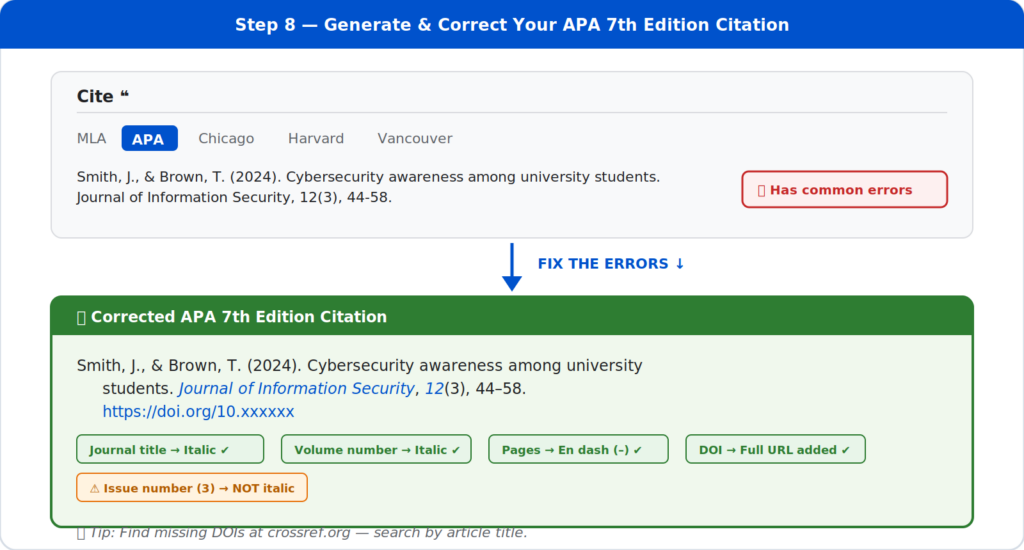 Step 8 β Generate and Correct Your APA 7th Edition Citation